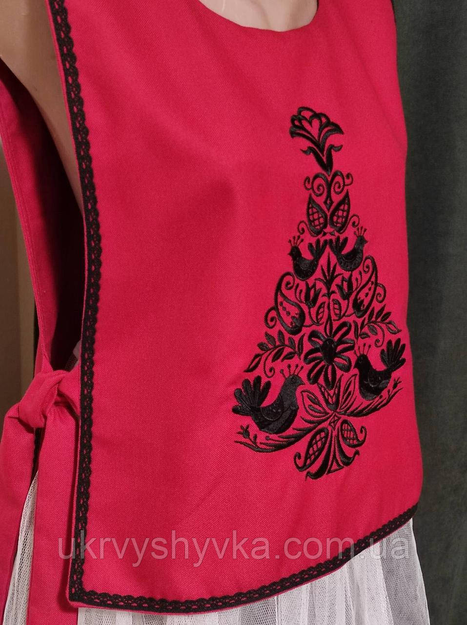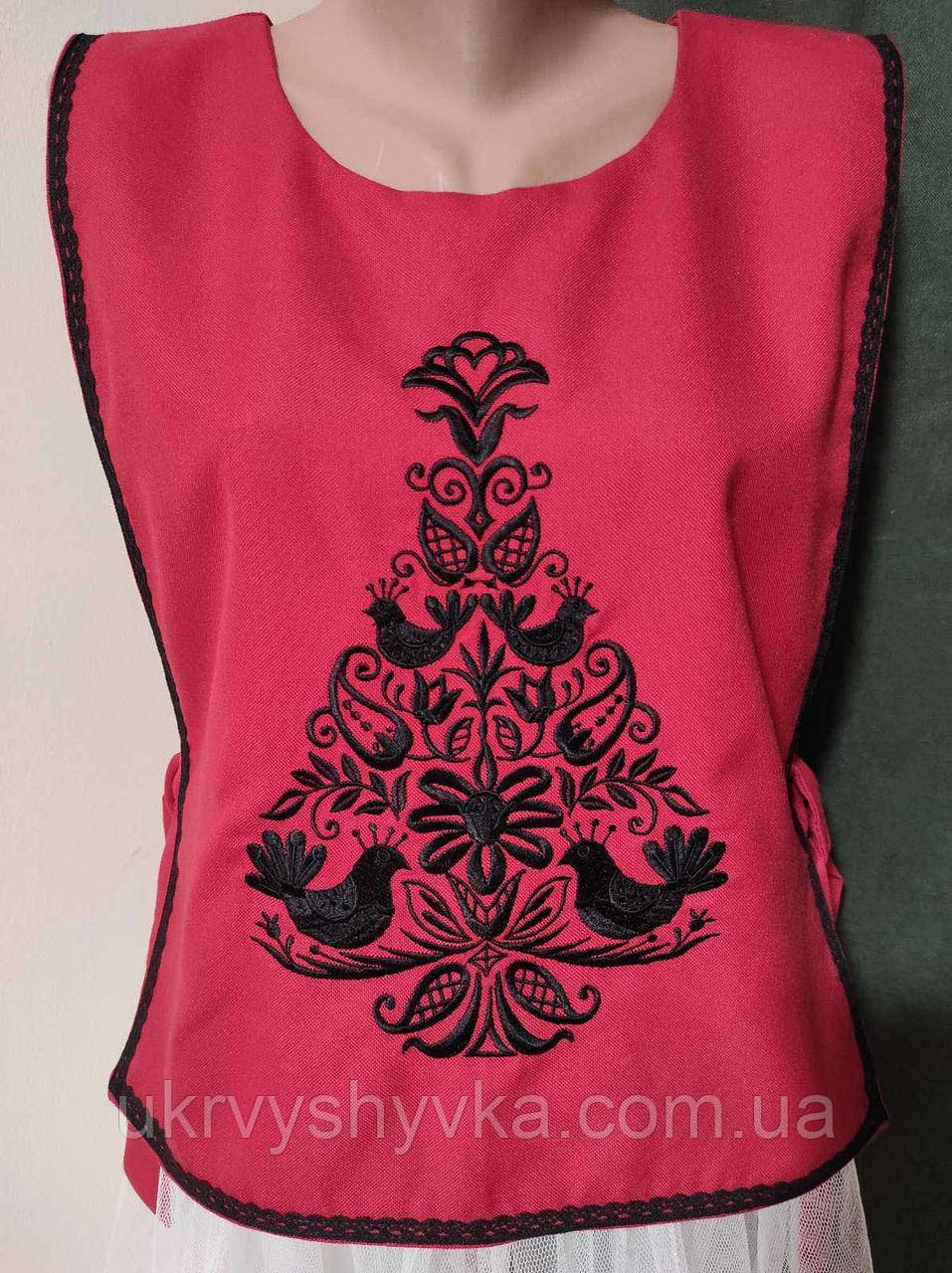 Вишита маніжка — стильний елемент українського одягу, який поєднує традиції та сучасний дизайн. Виконана з якісної тканини насиченого червоного кольору, оздоблена контрастною чорною вишивкою у вигляді птахів та квітів — символів любові, гармонії й відродження. Маніжка зручна у носінні, легко регулюється за об’ємом і чудово пасує до вишиванки чи сукні. Підходить для свят, виступів, фотосесій і повсякденного образу з українським характером. Така вишита жилетка стане особливою окрасою вашого гардероба та подарунком із душею.