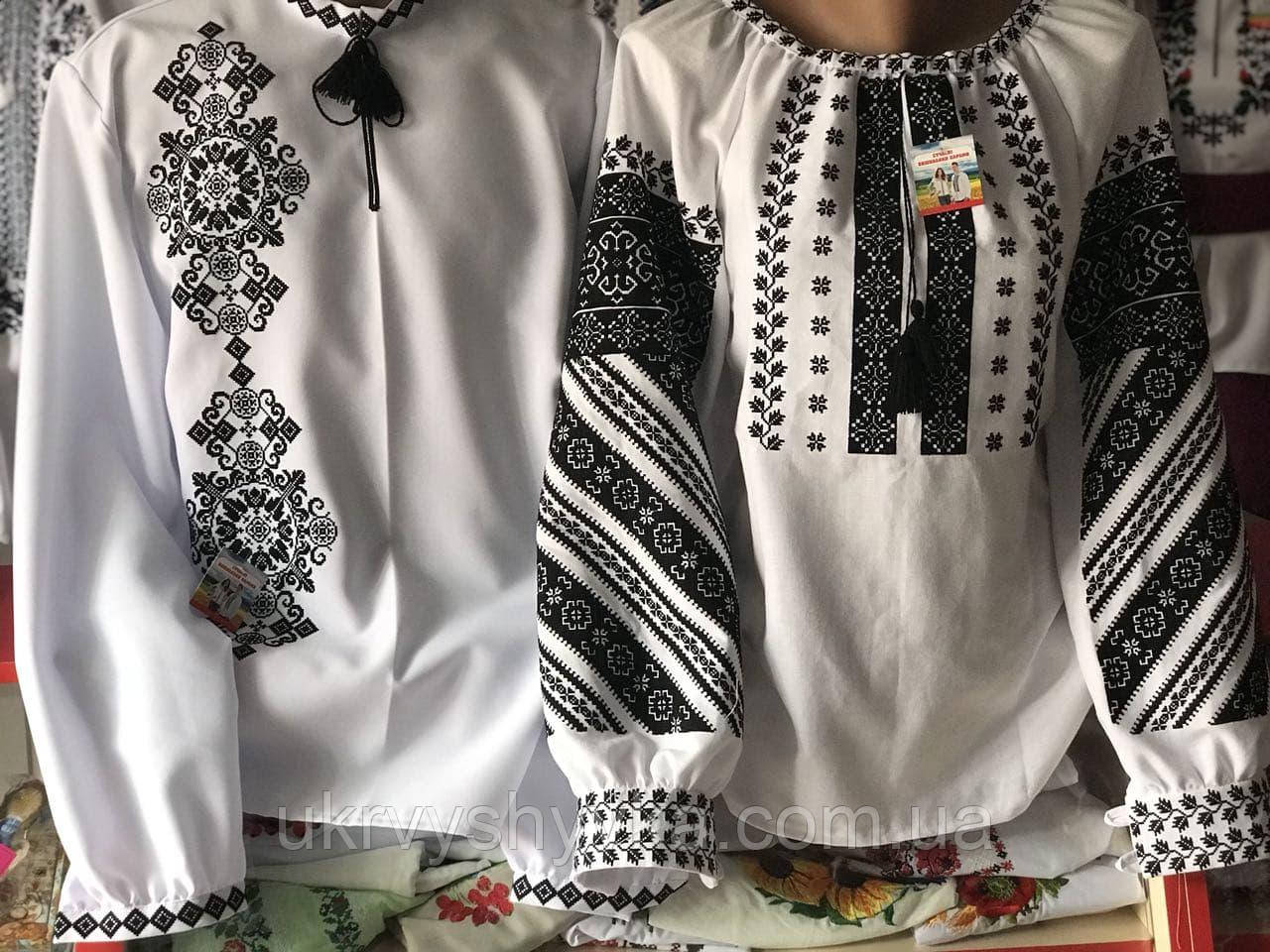 Монохромна чоловіча вишиванка з довгим рукавом і жіноча вишита сорочка з довгим рукавом. Колір вишиванки - білий і чорний підібраний по тону для чоловічої і жіночої вишиванки. Орнамент збагачує сорочки і підійде як для чоловічого крою сорочки, так і для жіночого.